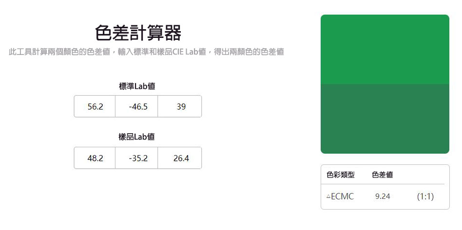 色差計算:輸入標準和樣品CIE Lab值,得出兩顏色的色差值